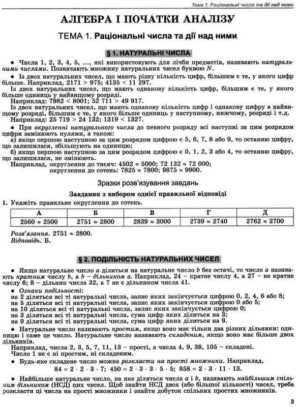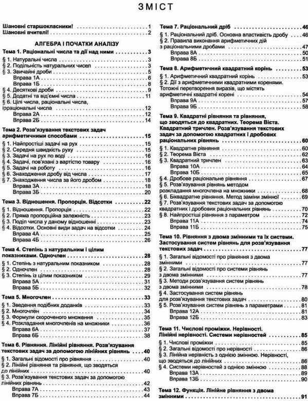 Посібник перероблено та доповнено відповідно до результатів апробації в закладах загальної середньої освіти в усіх областях України. Додано теми та зразки розв’язування вправ за програмою ЗНО профільного рівня. Тестові завдання доопрацьовано відповідно до специфікації, затвердженої УЦОЯО для сертифікаційної роботи з математики. Посібник стане в пригоді старшокласникам, абітурієнтам, усім, хто бажає систематизувати й узагальнити вивчене в школі та якісно підготуватися до ЗНО й ДПА.