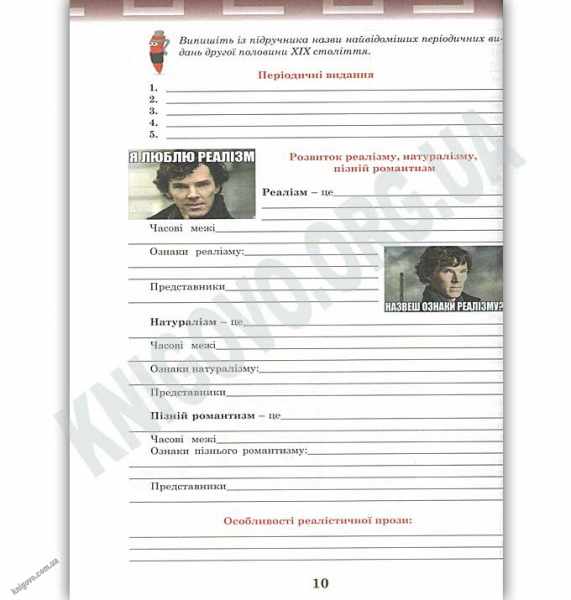 У зошиті (І і II семестри) пропонується сучасний підхід до вивчення програмо¬вих творів та теоретичного матеріалу. Цікаві факти про письменників, вивчення біографії через значення імені, «кольоровий» аналіз поезій, робота з таблицями «Нестрашна теорія», зауваження та поради «юрисконсульта», «політика» та «психолога», пропозиції критично міркувати над неоднозначними темами есе, а також меми й QR-коди роблять навчання жвавим і легким.
