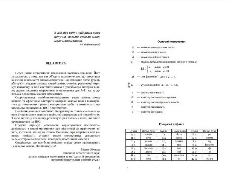 У І розділі крім теоретичного матеріалу шкільного курсу математики вміщено тренувальний тест зовнішнього оцінювання з математики та варіанти завдань для самоперевірки вступниками до вузів свого рівня підготовки.