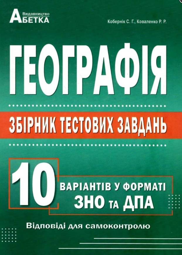 Географія Збірник тестових завдань 10 варіантів у форматі ЗНО та ДПА Кобернік С. Абетка. Посібник містить тестові завдання різних рівнів за змістом шкільних курсів географії та структурою тесту з географії ЗНО.