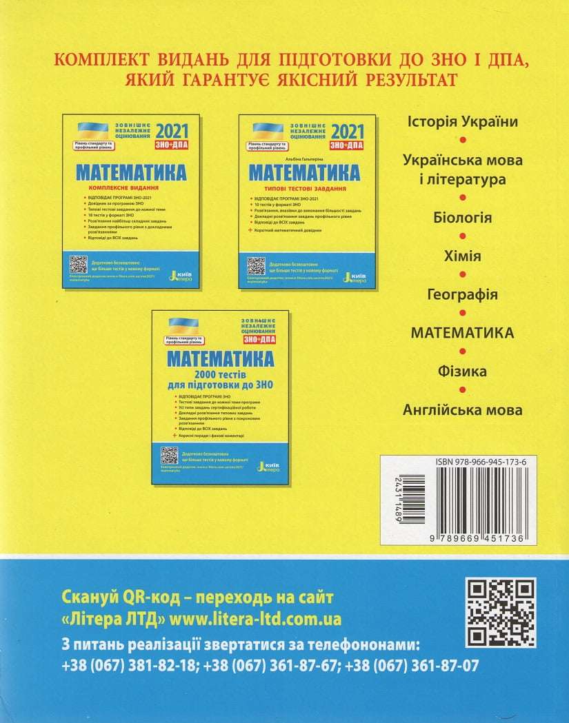Математика 2000 тестів для підготовки до ЗНО Рівень стандарту та профільний рівень Захарійченко Ю. Літера. Посібник призначений для ефективної підготовки до державної підсумкової атестації та зовнішнього незалежного оцінювання. Видання являє собою збірник завдань, які відповідають програмі ЗНО.
