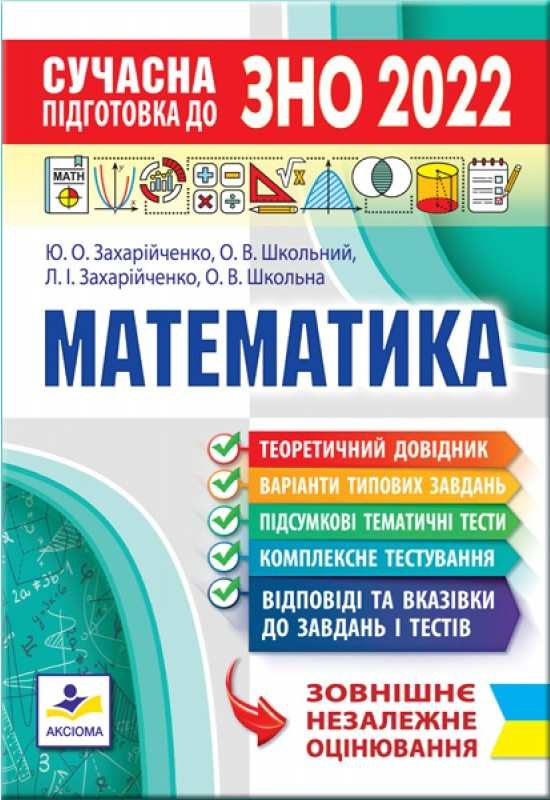 Сучасна підготовка до ЗНО 2022 з математики Захарійченко Ю. Аксіома. Посібник призначений для підготовки до ЗНО з математики і містить усі необхідні для цього теоретичні відомості та тренувальні завдання різних рівнів складності.