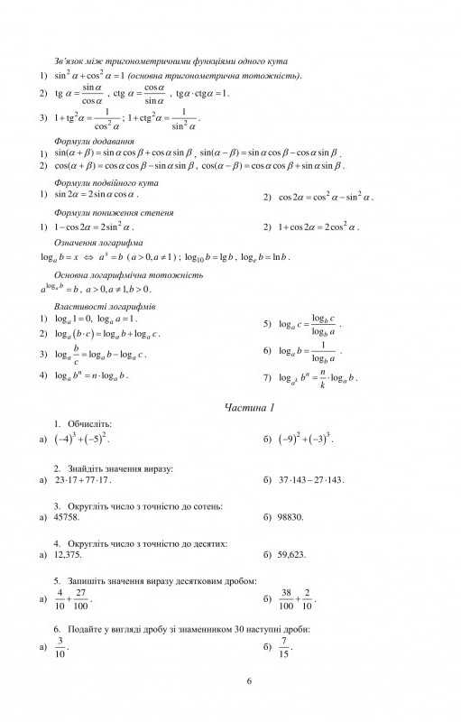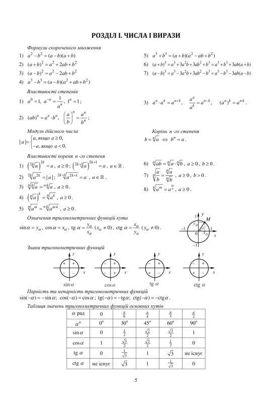 До кожного розділу подано тематичний тест, а наприкінці посібника наведено комбіновані тести у новому форматі ЗНО, введеному у 2021 році. До всіх тренувальних завдань і завдань тестів подано відповіді, а для найбільш складних завдань ще й вказівки для їх розв’язування.