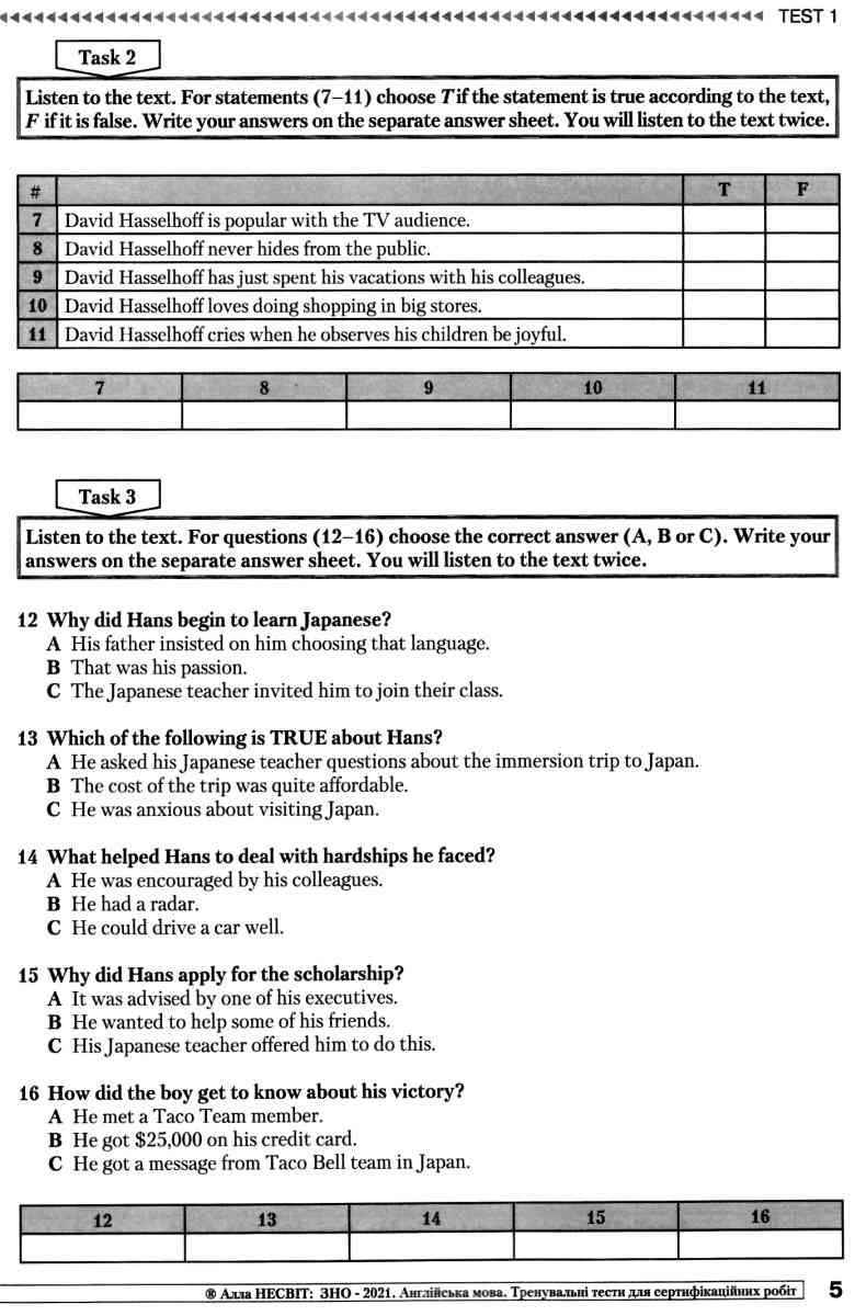 Видання містить п’ять тренувальних тестів, оформлених за вимогами сертифікаційної роботи, і дає можливість перевірити рівень комунікативної компетентності випускників шкіл щодо розуміння мови на слух (аудіювання), зорове сприймання (читання), використання мови та писемної взаємодії (письма).
