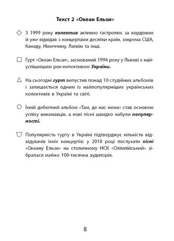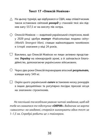 Посібник-тренажер містить 25 текстів з графічними маркерами та тестами до них, які належать до складних завдань національного мультипредметного тесту, а також відповіді з поясненнями. Згідно з офіційною статистикою Українського центру оцінювання якості освіти, 4 з 5 завдань до текстів з графічними маркерами належать до складних: з ними може впоратися в середньому 30% учасників НМТ. І це не дивно, адже тут потрібно не лише знати правила з розділу «Синтаксис, пунктуація», а й уміти застосовувати їх у роботі з незнайомим текстом. А найкраща стратегія роботи зі складними завданнями — це багато практики