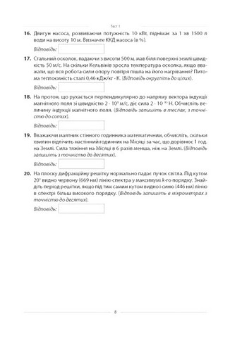 Опрацювання тестових завдань дає змогу як за допомогою вчителя, так і самостійно закріпити теоретичний матеріал з фізики. Посібник може бути використано при підготовці до зовнішнього оцінювання.