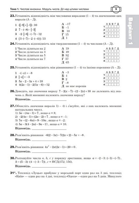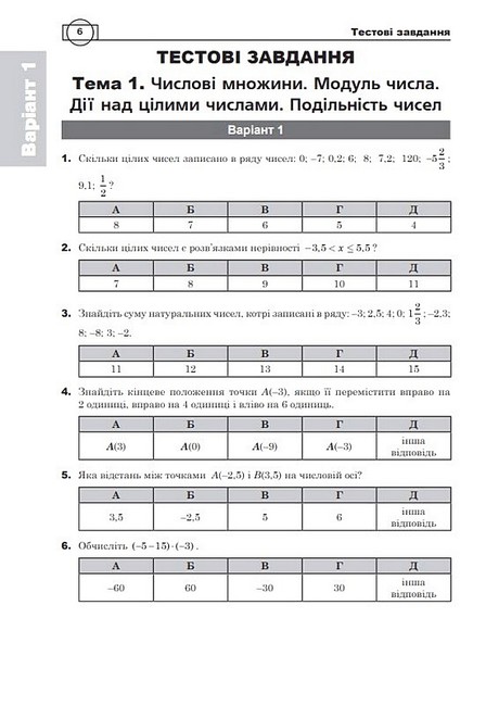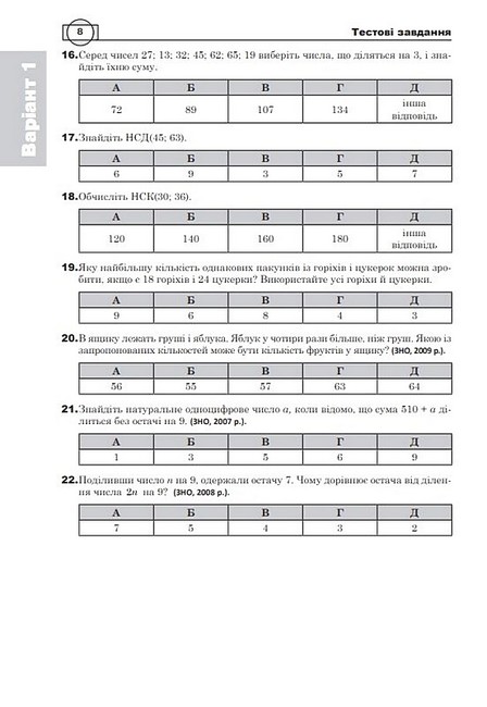 Метою пропонованого навчального посібника є організація самостійної роботи учнів при підготовці до зовнішнього незалежного оцінювання (ЗНО). Тестові завдання частини І містять тематичні завдання, укладені у двох рівноцінних варіантах до сімнадцяти тем з алгебри та математики 5-го – 6-го класів. Усі тестові завдання відповідають чинній програмі з математики для загальноосвітніх навчальних закладів та вимогам щодо написання сертифікаційної роботи ЗНО. Структура кожної з тем є аналогічною структурі тестів, пропонованих на ЗНО. До посібника додається довідник, у якому роз’яснена теорія кожної з тем та запропоновано розв’язання типових вправ і задач. До всіх завдань тестів подано відповіді. Для вчителів та учнів загальноосвітніх шкіл та профільних класів природничого та фізико-математичного спрямування.