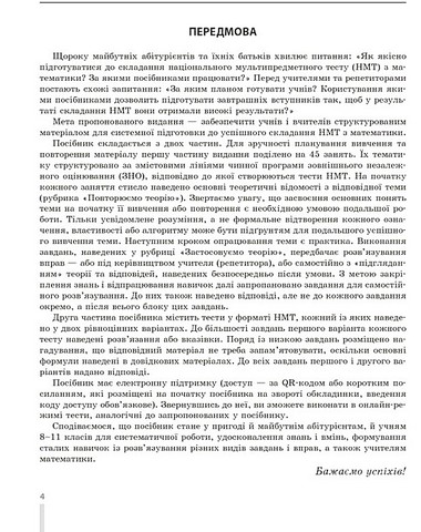 Посібник призначений для ефективної підготовки до національного мультипредметного тесту (НМТ) з математики. Видання являє собою довідник, який охоплює весь шкільний курс математики. До кожної теми наведено короткі підсумки, тренувальні вправи та відповіді до них. В електронному додатку запропоновано тренувальні тести у форматі НМТ, які можна виконати в онлайн-режимі. Користувачі також зможуть пройти пробне тестування. Посібник допоможе системно оновити та поглибити знання з математики.