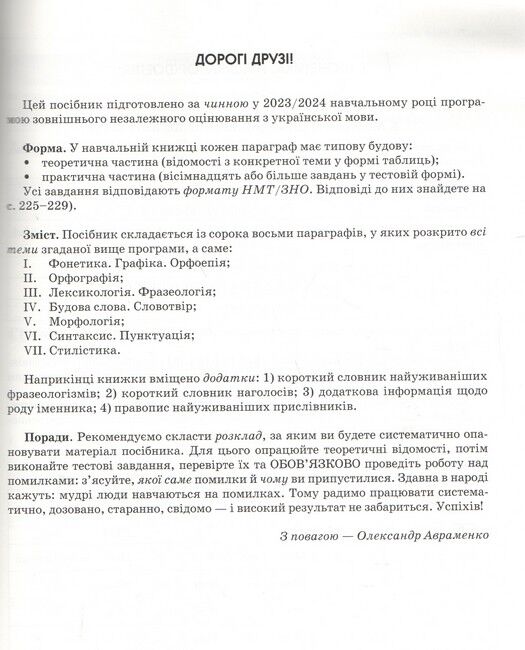 Посібник укладено відповідно до чинної програми ЗНО з української мови (2023/2024 навчальний рік).
