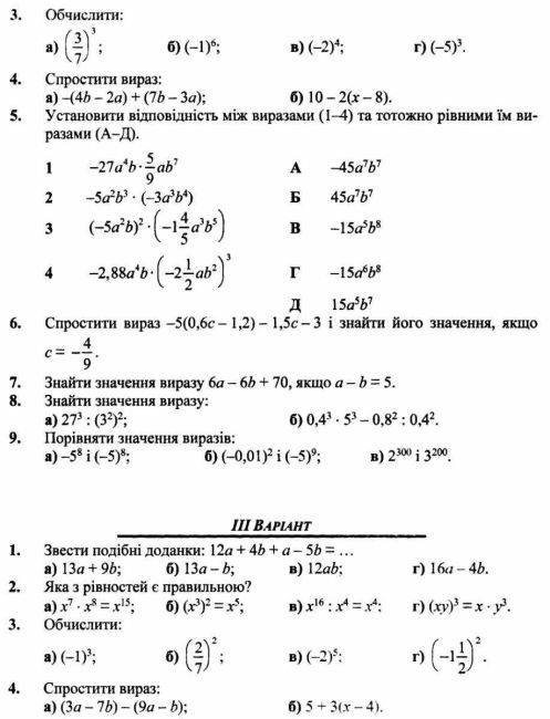 Посібник містить завдання для контрольних і самостійних робіт за всіма темами курсу алгебри 7 класу.