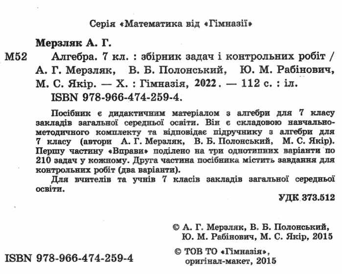 Збірник задач і контрольних робіт Алгебра 7 клас Нова програма Авт: А.Г. Мерзляк та ін. Вид-во: Гімназія 96613