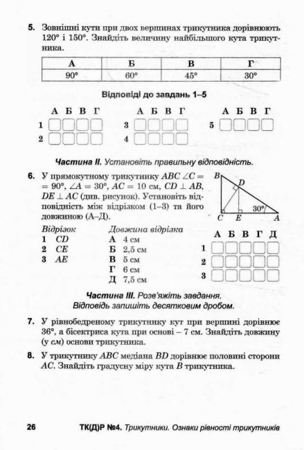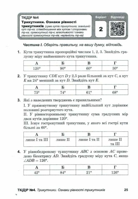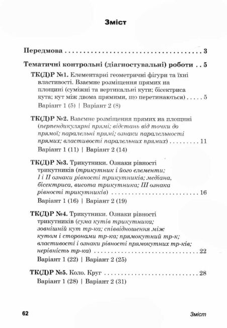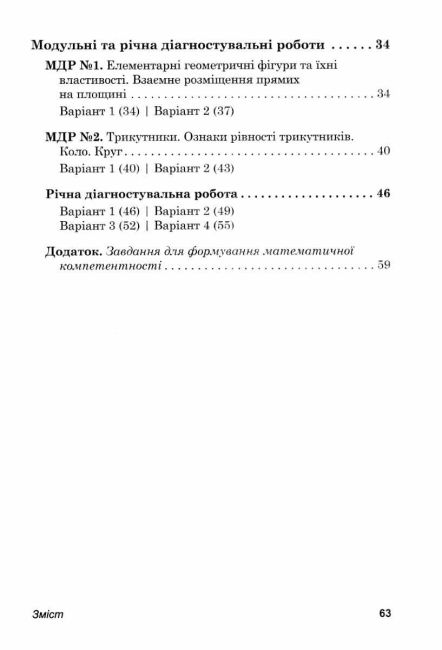 Посібник містить 5 тематичних контрольних (діагностувальних) робіт, 2 модульні (семестрові) діагностувальні роботи у двох варіантах та річну діагностувальну роботу з геометрії у чотирьох варіантах. Зміст завдань усіх робіт відповідає Державному стандарту базової середньої освіти, діючій програмі з математики та програмі ЗНО. Завдання для формування математичної компетентності предсталені у додатку. Посібник допоможе вчителю так організувати навчальний процес, щоб учні 7-го класу поступово ознайомилися зі структурою, змістом та оцінюванням завдань з геометрії у форматі ЗНО/НМТ, планомірно готувалися та оцінювали свої здатності. Він може бути використаний як готовий дидактичний матеріал для тематичного та підсумкового оцінювання навчальних досягнень з геометрії. Відповіді до завдань усіх діагностувальних робіт можна переглянути, відсканувавши смартфоном QR-код на початку кожного варіанту.