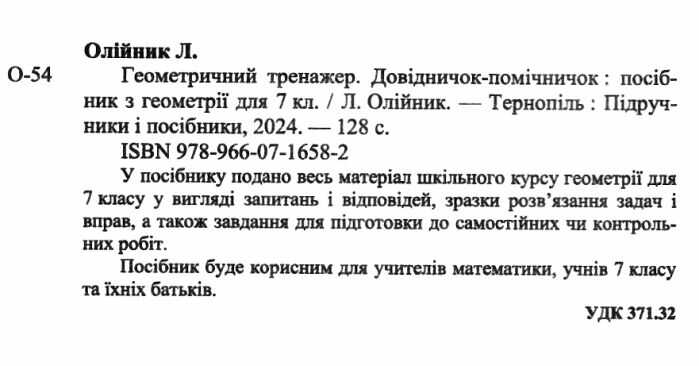 Геометричний тренажер 7 клас Нова програма Авт: Олійник Л. Вид-во: Підручники і посібники