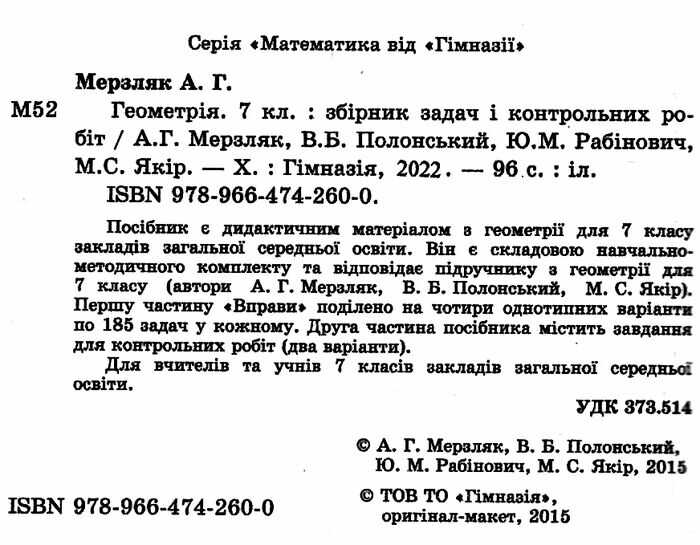 Збірник задач і контрольних робіт Геометрія 7 клас Нова програма Авт: А.Г. Мерзляк та ін. Вид-во: Гімназія 96612