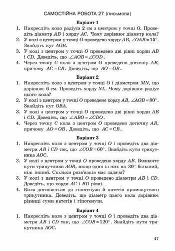 Збірник самостійних і контрольних робіт з геометрії для 7 класу складений за Новою програмою до підручника А. П. Єршової, В. В. Голобородька, О. Ф. Крижановського Геометрія 7 клас. Збірник складається з трьох частин. До частини І увійшли самостійні роботи, поділені на 10 навчальних блоків. Блоки відповідають основним етапам вивчення курсу геометрії 7 класу. До кожного блоку входять 3 самостійні роботи: на готових кресленнях, теоретична та письмова. До частини ІІ включено 5 контрольних робіт, до частини ІІІ — 5 тестів для підготовки до контрольних робіт. Призначено для учнів 7 класу загальноосвітніх навчальних закладів і вчителів математики.