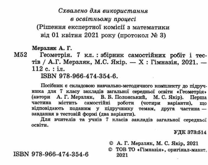 Посібник є складовою навчально-методичного комплекту до підручника для 7 класу закладів середньої освіти "Геометрія" (автори Мерзляк, Полонський, Якір).