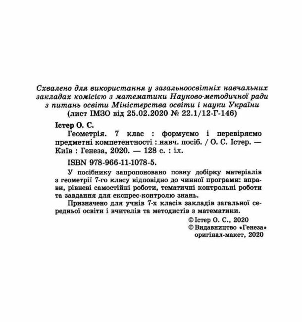Геометрія 7 клас Формуємо і перевіряємо предметні компетентності Навчальний посібник Істер О. Генеза. Схвалено для використання у загальноосвітніх навчальних закладах