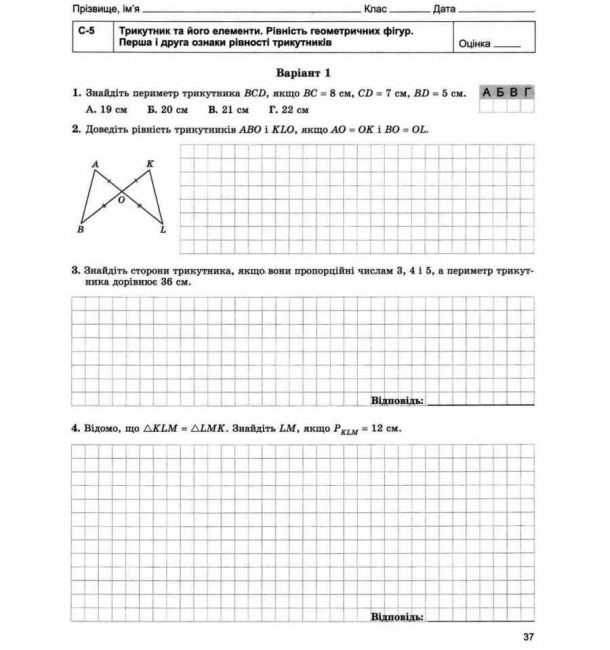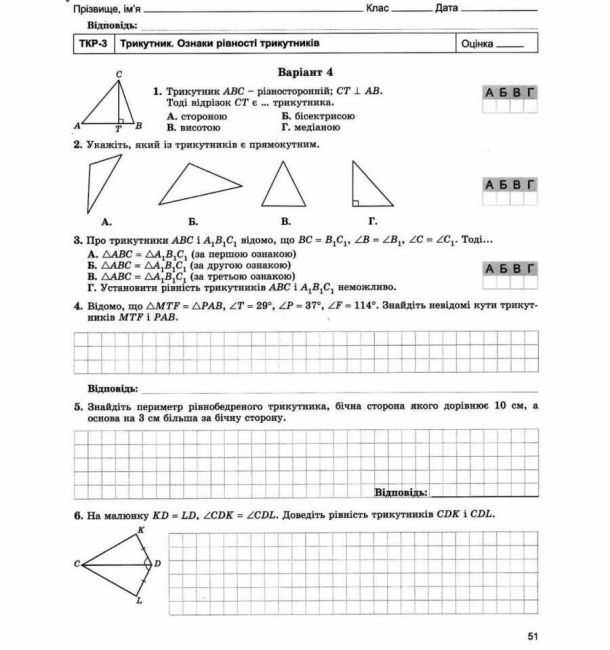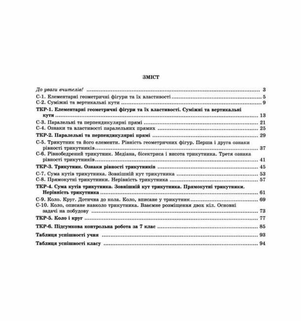 Посібник містить дидактичні матеріали за новою програмою для перевірки рівня навчальних досягнень учнів 7 класу з геометрії: 10 самостійних та 6 тематичних контрольних робіт. Завдання кожної роботи диференційовано за рівнями оцінювання навчальних досягнень учнів. У передмові надано методичні рекомендації щодо проведення, оформлення та оцінювання робіт.
