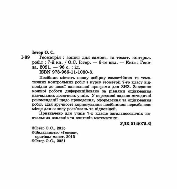 Геометрія Зошит для самостійних та тематичних контрольних робіт 7 клас Істер О. Генеза. Призначено для учнів 7-х класів загальноосвітніх навчальних закладів та вчителів математики.