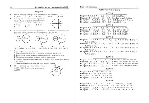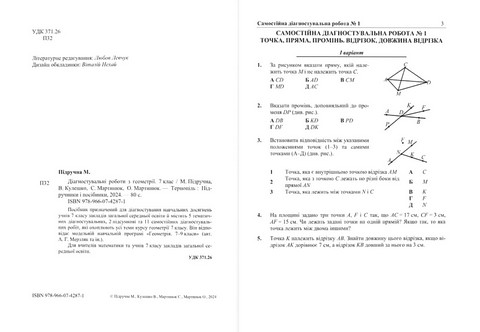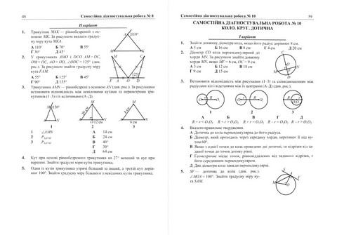 Посібник призначений для діагностування навчальних досягнень учнів 7 класу закладів загальної середньої освіти й містить 5 тематичних діагностувальних, 2 підсумкові та 11 самостійних діагностувальних робіт, які охоплюють усі теми курсу геометрії 7 класу. Він відповідає модельній навчальній програмі «Геометрія. 7–9 класи» (авт. А. Г. Мерзляк та ін.).