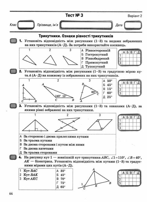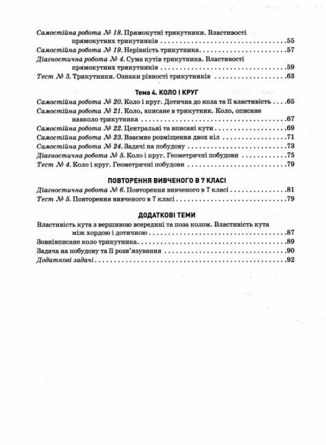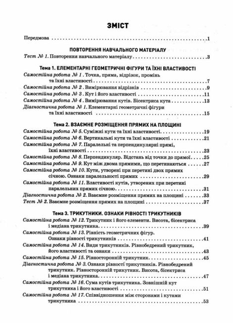 Посібник складено відповідно до Модельної навчальної програми "Геометрія. 7-9 класи" для закладів загальної середньої освіти (автор Істер О.С.) і призначено для організації поточного й підсумкового (тематичного) оцінювання навчальних досягнень учнів 7-х класів з алгебри. Матеріал посібника структуровано за темами, кожна з яких містить самостійні й діагностичні роботи, а також тести у двох рівноцінних варіантах. У посібнику передбачено і рівневе, і бальне оцінювання результатів навчання - його здійснюють або за рівнями досягнень, (початковий, середній, достатній, високий) або за 12-бальною шкалою. Запропоновані роботи можуть бути використані також і для формувального оцінювання, тобто без оцінювання в балах.