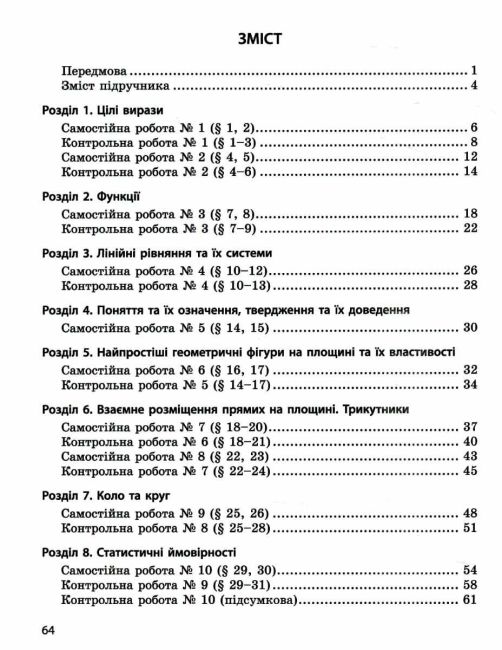 \nЗбірник містить 10 самостійних робіт (у 4-х варіантах) і 10 контрольних робіт (у 2-х варіантах) і може бути використаний для здійснення формувального та підсумкового оцінювання навчальних досягнень з математики учнів 7 класів НУШ.