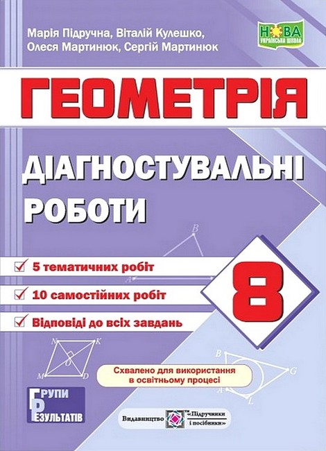 Посібник призначений для діагностування навчальних досягнень учнів 8 класу закладів загальної середньої освіти й містить 5 тематичних діагностувальних, 2 підсумкові та 10 самостійних діагностувальних робіт, які охоплюють усі теми курсу геометрії 8 класу. Він відповідає модельній навчальній програмі «Геометрія. 7–9 класи» (авт. О. С. Істер).