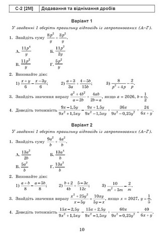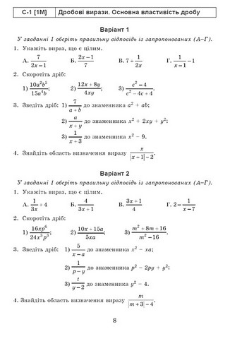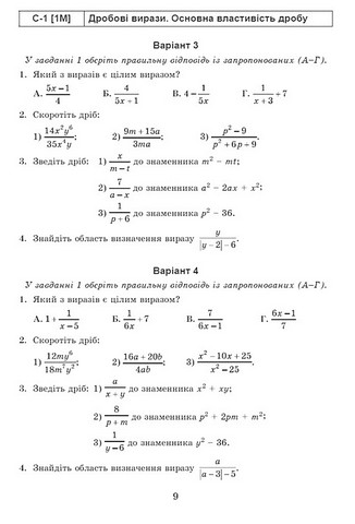 Посібник містить добірку самостійних, тематичних діагностичних (контрольних), семестрових і підсумкової письмових робіт для перевірки й оцінювання результатів навчання, зміст яких відповідає модельним навчальним програмам «Алгебра. 7–9 класи» і «Математика (інтегрований курс). 7–9 класи» (автор О.С. Істер) та критеріям оцінювання з математики. Семестрові роботи подано у 2-х варіантах, усі інші роботи – у 4-х однотипних варіантах.
