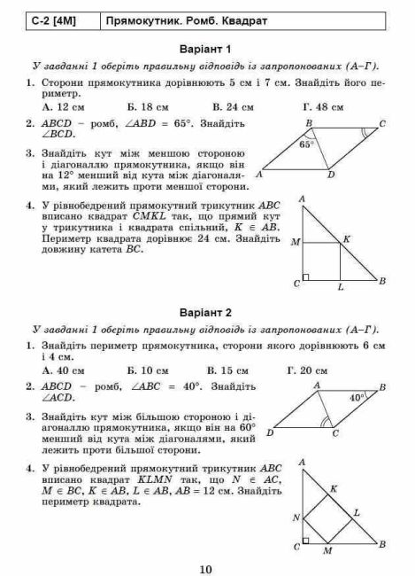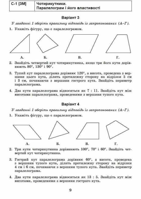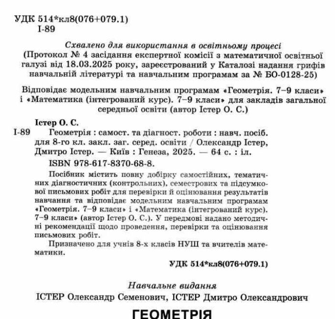 Посібник містить повну добірку самостійних, тематичних діагностичних (контрольних), семестрових та підсумкової письмових робіт для перевірки й оцінювання результатів навчання та відповідає модельним навчальним програмам «Геометрія. 7-9 класи» і «Математика (інтегрований курс). 7-9 класи» (автор Істер О. С.). У передмові надано методичні рекомендації щодо проведення, перевірки та оцінювання письмових робіт.