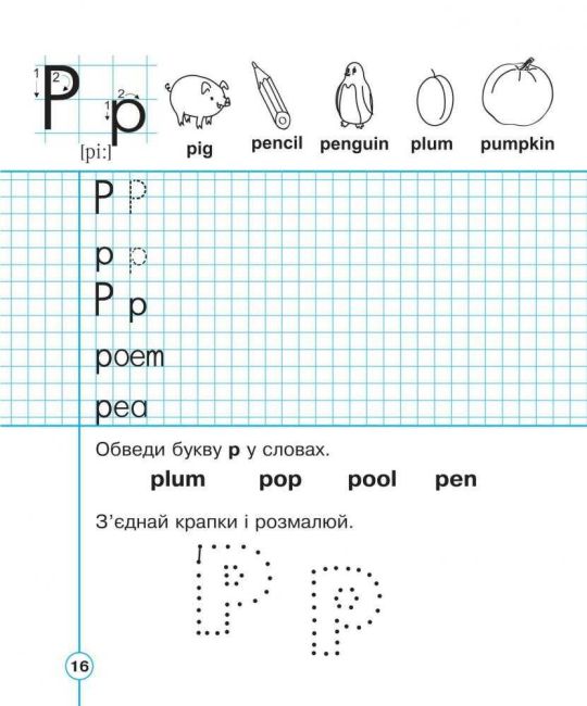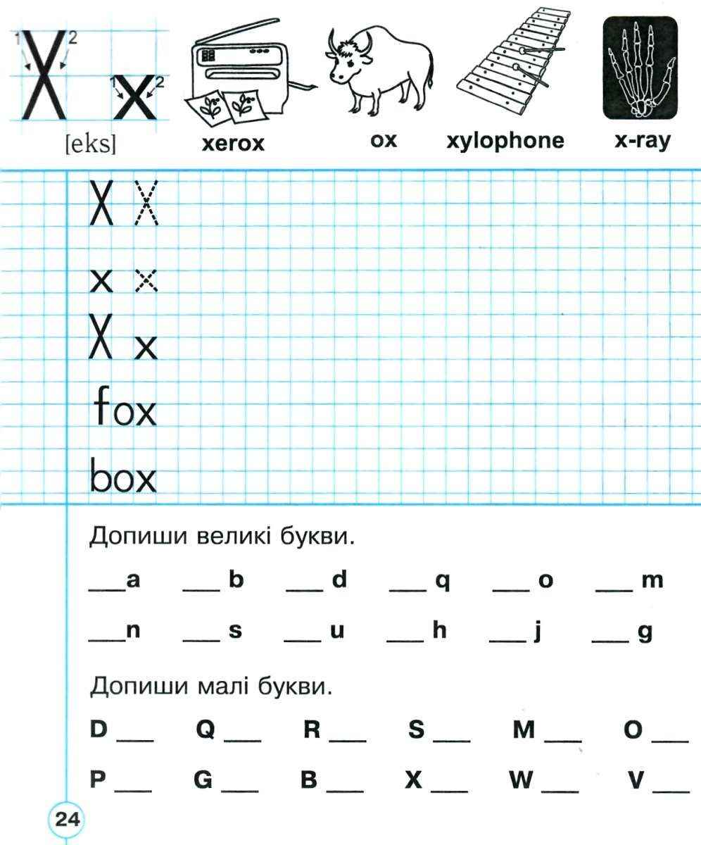 Друковні літери Клітинка прописи відповідають типовим освітнім програмам та Державному стандарту початкової освіти. Посібник укладено до підручників з англійської мови для 1-го класу авторів: О.Д. Карпюк, Х.К. Мітчел, І.В. Доценко та ін., Т.Б. Будна. У виданні подано зразки написання великих та малих літер англійської абетки та показано послідовність їх накреслення. Цікаві та захоплюючі завдання, розроблені відповідно до вікових особливостей першокласників, сприятимуть виробленню навичок письма, кращому засвоєнню графічної структури літер, допоможуть збагатити словниковий запас дитини.