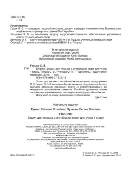 Зошит для письма з англійської мови укладено до підручника С. В. Гунько, З. В. Коновалюк Англійська мова підручник для 1 класу закладів середньої загальної освіти з аудіосупроводом за методикою асоціативних символів. Посібник допоможе учням засвоїти лексичний матеріал та опанувати графіку ангійської мови.