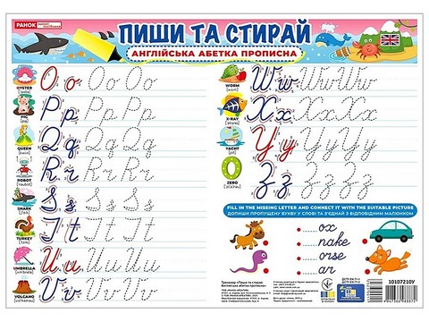 \nЗавдяки спеціальному глянцевому покриттю написи можна багаторазово писати та стирати вологою серветкою. Компактний формат підходить для занять удома, у школі чи дитячому садку. Чіткий друк на міцному папері, великий шрифт і яскраві ілюстрації роблять навчальний процес ефективним та захопливим. Окрім цього на звороті розміщені ще 8 вправ для закріплення отриманих навичок.