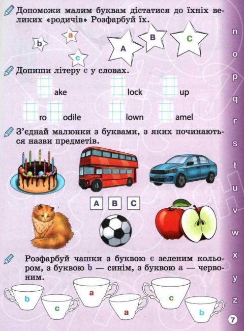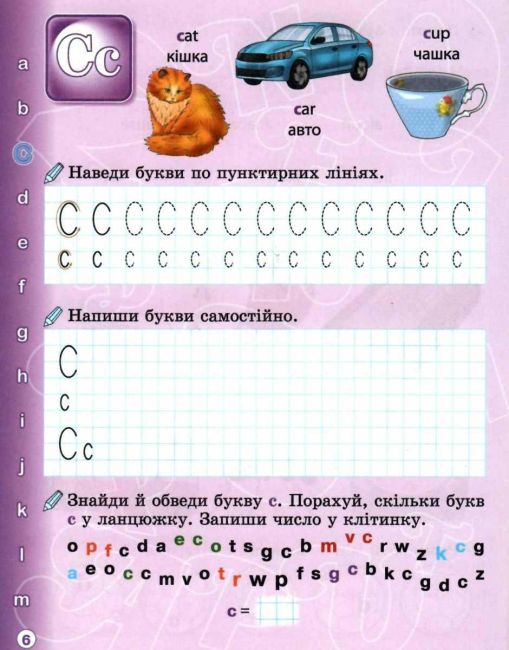 Пропонований зошит розроблений допомогти учням першого класу вивчити англійський алфавіт і навчитися писати літери. Посібник містить зразок написання кожної літери, що супроводжується стрілочками, які вказують, звідки починати, як писати і де закінчувати. Кожна літера, велика і мала, подана пунктірним шрифтом, що допоможе учневі сформувати навичку письма. У зошиті дібрані цікаві й різноманітні завдання, що допомагають краще запам’ятовувати літеру, її написання, збагачувати словниковий запас. Урізноманітнюють зошит завдання з калькою.