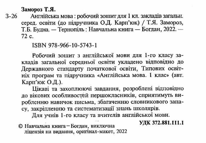 Робочий зошит Англійська мова 1 клас НУШ До підручника Карпюк О.Д. Авт: Замороз Т.Я. Будна Т.Б. Вид-во: Богдан 20165