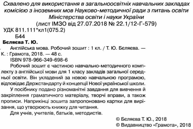 Робочий зошит є частиною навчально-методичного комплекту з англійської мови для 1 класу закладів загальної середньої освіти. Він укладений за новою навчальною програмою, відповідає Держстандарту й концепції Нової української школи.