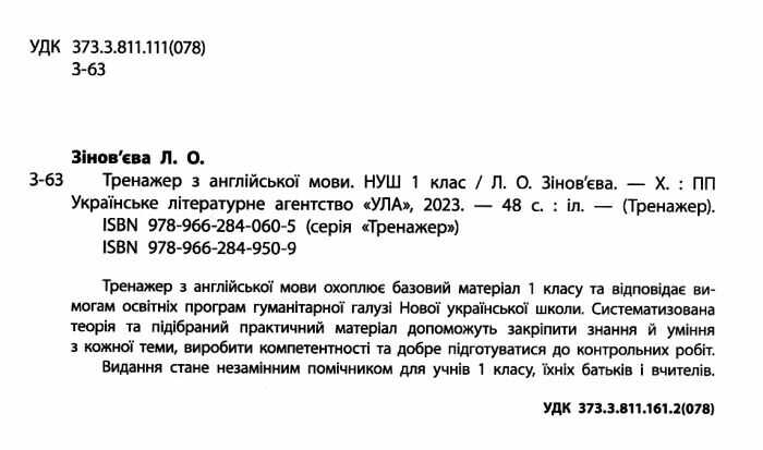 Тренажер з англійської мови НУШ 1 клас Зінов’єва Л. УЛА Нова українська школа