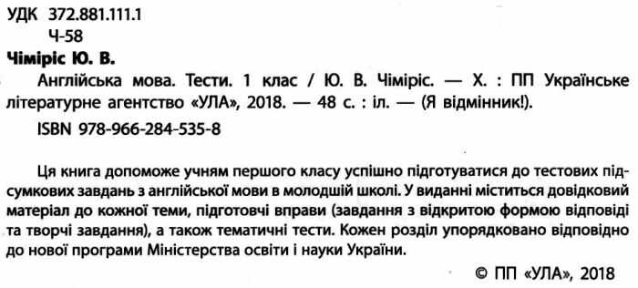 Тести Англійська мова Я відмінник 1 клас Авт: Чіміріс Ю.В. Вид-во: УЛА 20071