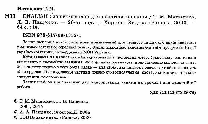 Зошит-шаблон з англійської мови призначений для першого та другого років навчання у закладах загальної середньої освіти. Відповідає типовим освітнім програмам Нової української школи, затвердженим МОН України.