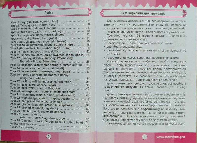 Тренажер самодостатній, тобто він містить абсолютно все, що потрібно дитині для успішного виконання вправ. Якщо значення якогось слова не буде зрозуміло з малюнка, його можна подивитися у словничку, який надається наприкінці книжки. Там же ви знайдете тексти аудіозаписів.
