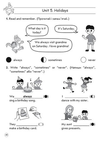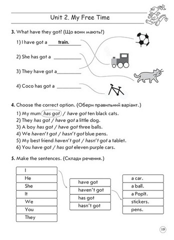 \nЗміст кожної теми, добір мовного та граматичного матеріалу відповідають типовим освітнім програмам МОН для другого класу, саме тому тренажер може використовуватись як під час уроків, так і для додаткового поглибленого вивчення. Представлені вправи, завдання пошукового характеру, кросворди, розмальовки, лабіринти сприятимуть розвитку допитливості, творчості, самостійності, а також мотивуватимуть до вивчення іноземної мови.