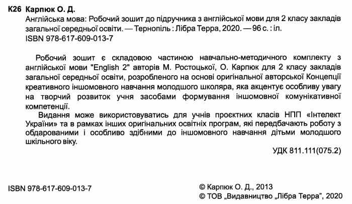 Робочий зошит Англійська мова Workbook 2 клас НУШ З поглибленим вивченням Авт: Карпюк О.Д. Вид-во: Лібра Терра 38149