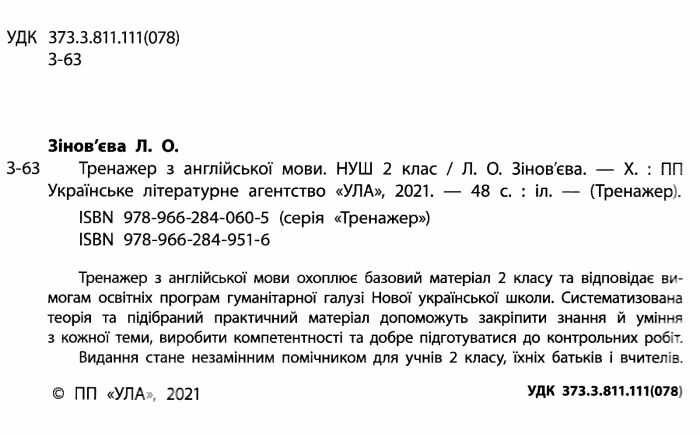 Тренажер з англійської мови НУШ 2 клас Зінов’єва Л. УЛА. Тренажер з англійської мови охоплює базовий матеріал 2 класу та відповідає вимогам освітніх програм гуманітарної галузі Нової української школи.