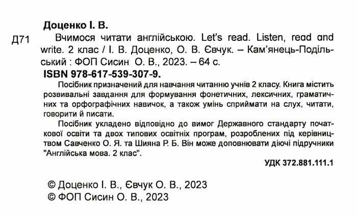 Посібник Вчимося читати англійською Listen read and write 2 клас НУШ Авт: Доценко І.В. Євчук О.В. Вид: Абетка 22542