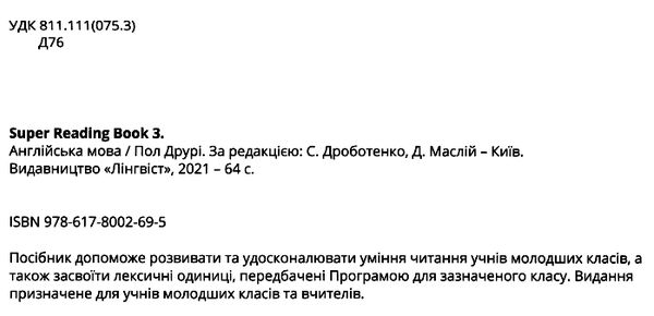 Нова українська школа НУШ Англійська мова 3 клас Посібник з читання Super Reading Book Drury P. Лінгвіст. це посібник, розроблений спеціально для дітей молодшого шкільного віку, який допоможе учням розвинути та удосконалити навички читання.