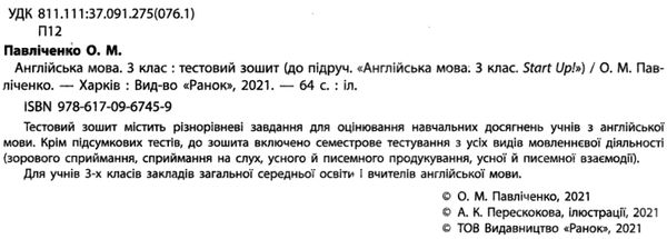 НУШ Англійська мова Start Up! 3 клас Тестовий зошит Павліченко О. Ранок. Тестовий зошит містить різнорівневі завдання для оцінювання навчальних досягнень учнів з англійської мови.
