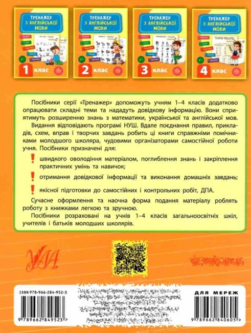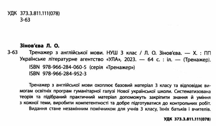 Тренажер з англійської мови НУШ 3 клас Зінов’єва Л. УЛА. Тренажер з англійської мови охоплює базовий матеріал 3 класу та відповідає вимогам освітніх програм гуманітарної галузі Нової української школи.
