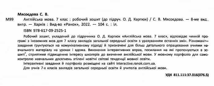 Англійська мова 7 клас Оновлена програма Робочий зошит до підручника Карп’юк О. Авт: Мясоєдова С. Вид-во: Ранок