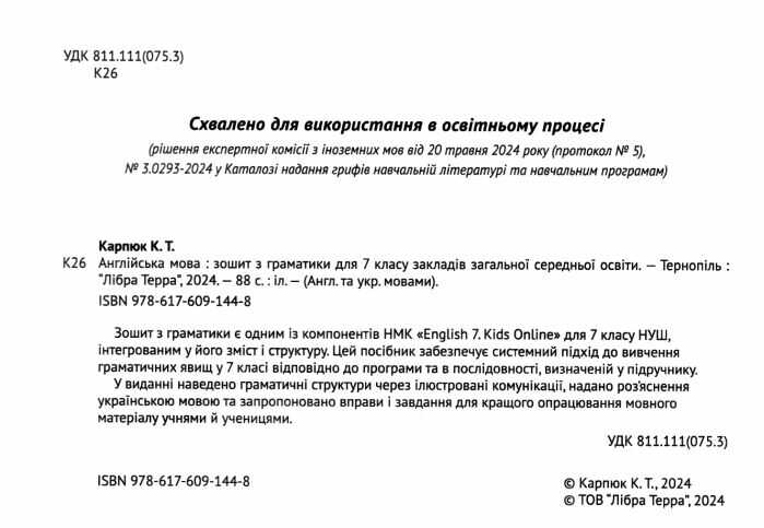Зошит з граматики інтегровано в НМК “English. Kids Online” для 7-го класу НУШ. Зошит забезпечує системний підхід у вивченні граматичних явищ у 7-му класі.