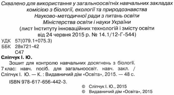 Зошит для контролю навчальних досягнень з біології 7 клас Нова програма Авт: Сліпчук І.Ю. Вид-во: Освіта 13813