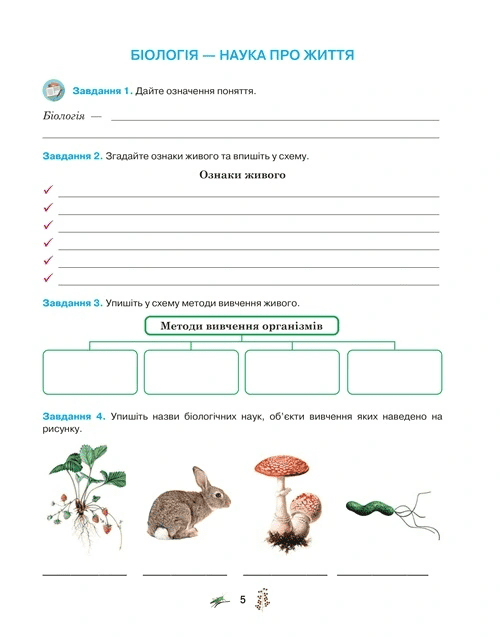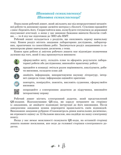 Робочий зошит учня складається з розділів, що охоплюють 5 навчальних тем програми. Кожен розділ розпочинається з навчальних завдань, містить лабораторні дослідження, практичні та самостійні роботи, а закінчується завданнями з контролю навчальних досягнень та для повторення. Використання зошита звільняє учня від непродуктивної механічної роботи, орієнтує на обовязкові результати навчання, сприяє творчому підходу до засвоєння знань.